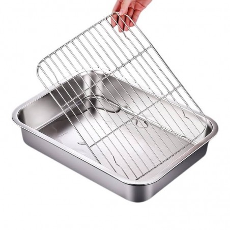 Bandeja de acero inoxidable de 35 cm con parrilla removible, ideal para lasañas y asados.