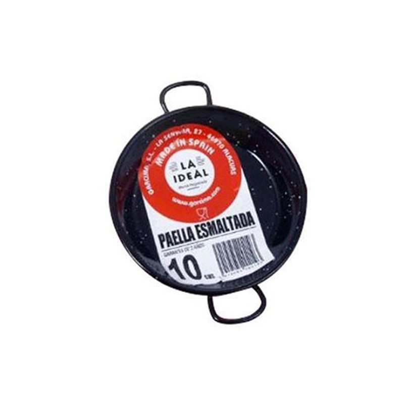 Paellera esmaltada de la marca Garcima de 10 cm de diámetro. Este modelo es apto para todo tipo de cocinas incluída la inducción. Gracias al recubrimiento esmaltado, no tiene que tener ningún cuidado especial a la hora de guardarla. Ideal para hacer paellas, con una capacidad para cuatro personas. Para un cocinado uniforme recomendamos el uso de un paellero.