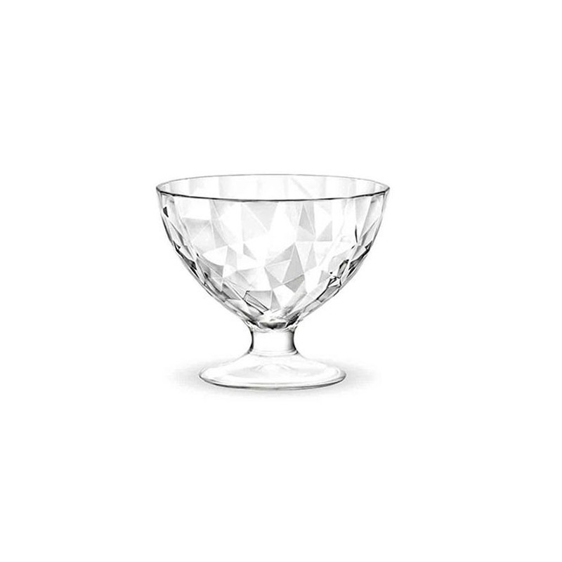 Copa helado del modelo Diamond de la marca Bormioli Rocco de 10.2 cm de diámetro. Fabricado en vidrio transparente elegante de gran calidad con un toque moderno. Trae un diseño exquisito que semeja un diamante tallado de estilo irregular para un tacto moderno pero elegante. El cristal transparente es ideal para mostrar helados y gran variedad de otros deliciosos postres.