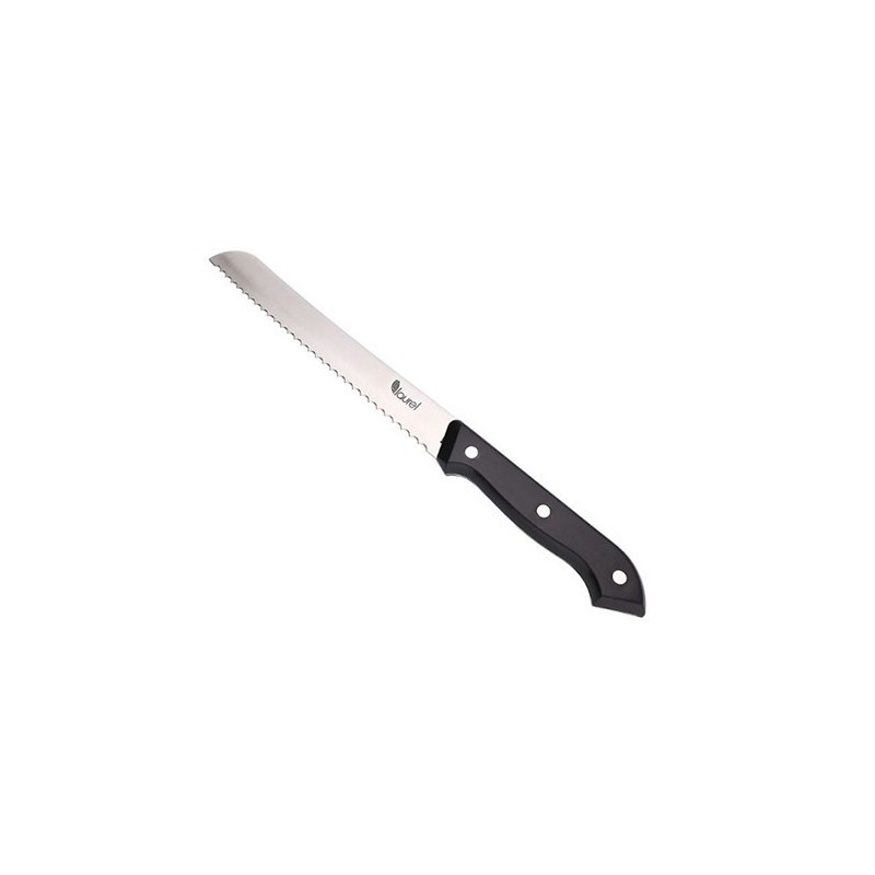 Cuchillo para pan de 8 pulgadas de la marca Laurel. Con mango ABS termoplástico resistente hasta 150 grados, resistente a los golpes y una baja absorción del aguaestilizado totalmente ergonómico sin renunciar al estilo, de gran comodidad de uso. Fabricado de acero inoxidable, con filo de sierra con un mayor poder de corte y durabilidad. Los dientes del cuchillo cortan sin dificultad todo tipo de pan desde pan de barra hasta pan de molde. Remaches de acero inoxidable que aumentan la vida útil del cuchillo por su filo completo.