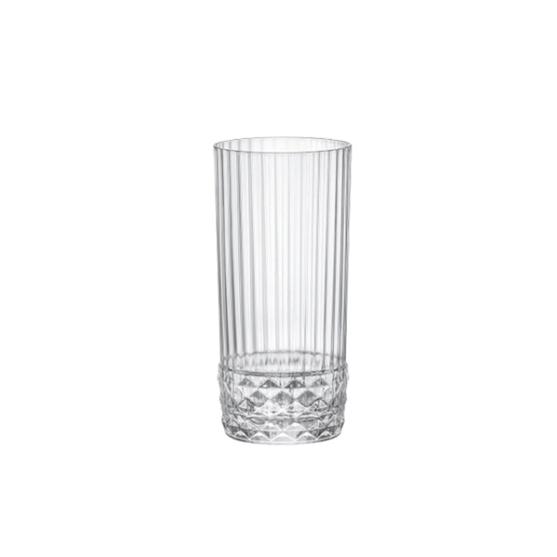 Vaso hb del modelo America20's de la marca Bormioli Rocco de 13 oz. Fabricado en vidrio transparente elegante de gran calidad con un toque moderno. Banda en relieve con decorado geométrico en la parte inferior. Duraderas en el uso diario gracias a su resistencia al choque térmico.