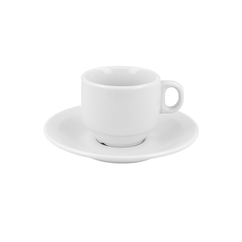 Taza de café apilable con plato de 90cc, porcelana resistente, apta para lavavajillas y microondas.