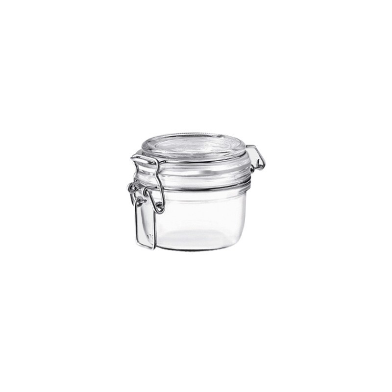 Tarro hermético del modelo Fido de la marca Bormioli Rocco de 125 cc en transparente, una pieza muy valorada y resistente.